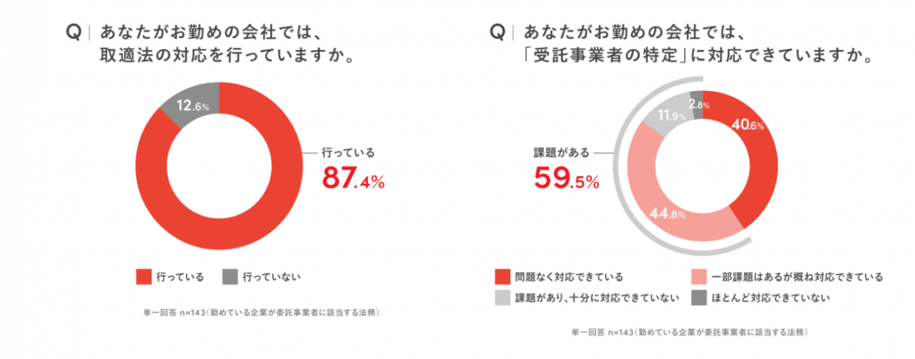 一方、取適法の改正により「受託事業者」の対象範囲が広がった中で、新たに増加した受託事業者の特定について、59.5%が「課題がある」と回答しており、「問題なく対応できている」と回答したのは40.6%に留まる結果となった。