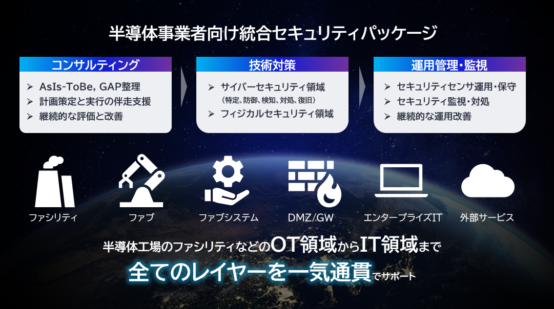 半導体工場のOT領域(ファシリティ、ファブ)、ファブシステム、MESや業務システムなどのIT領域を包括的にカバーし、コンサルティングから設計・実装、運用・監視までを一気通貫で支援すると述べている。