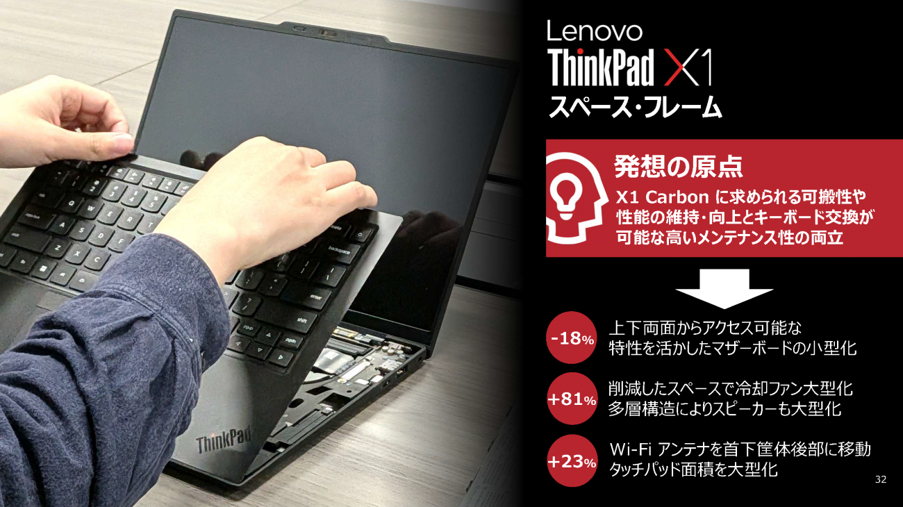スペース・フレームは、マザーボードを両面実装にし、筐体の上下両面から内部へアクセス可能にすることでこの問題を解決。マザーボードを従来比で約18%小型化し、その余剰スペースをサーマルモジュールの大型化に充てたという。X1 Carbon Gen 14では、サーマルモジュールのサイズを前年比で81%も拡張しながら、本体重量は約977g~を維持しているとした。