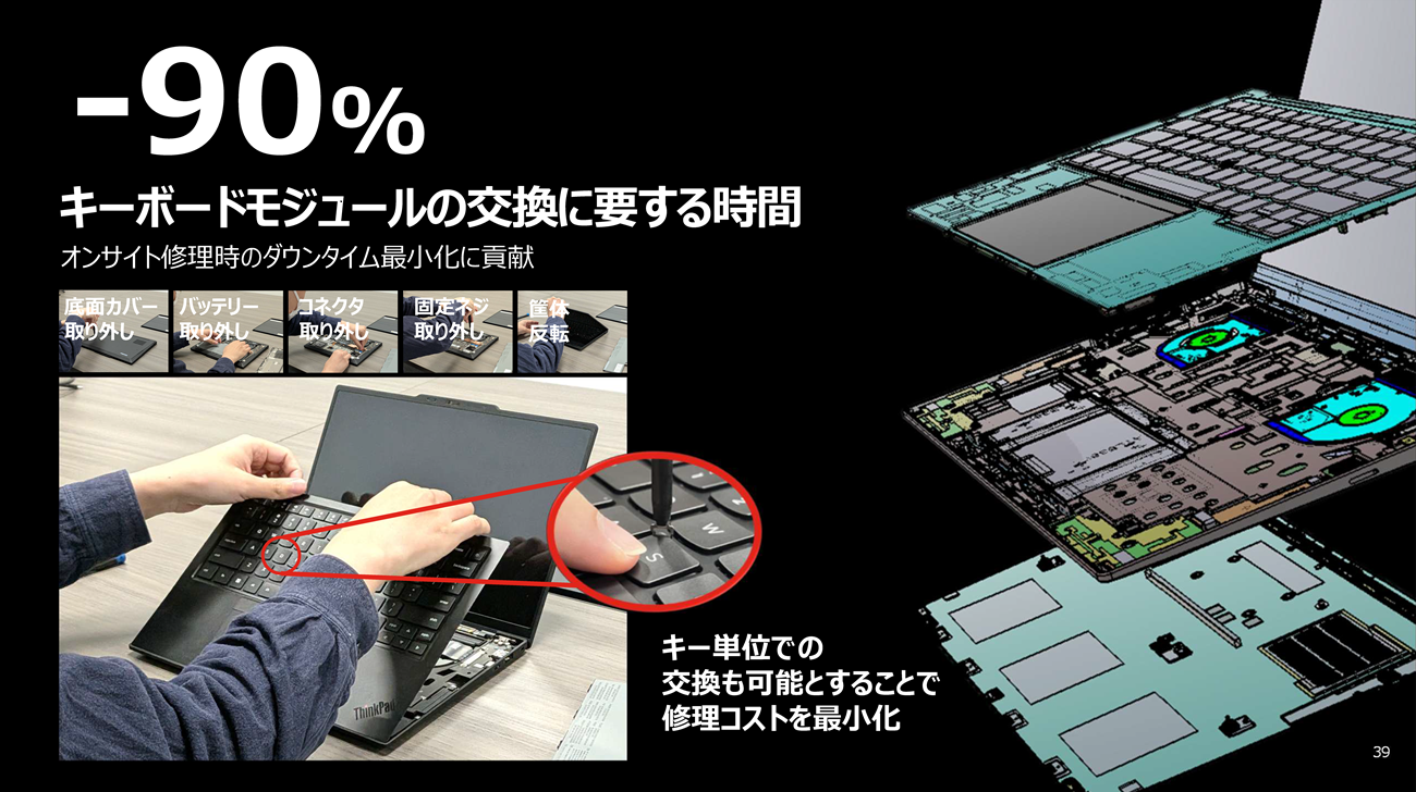 また企業におけるPC導入指標の一つとして、保守性と運用コストが挙げられる。これまでの構造では、キーボードの交換にバッテリーやマザーボードまで取り外す必要があったが、スペース・フレームを採用したモデルでは、直接キーボードとそのカバーを取り外すことが可能になり、さらに“キー単体”での交換もできるようになったという。これにより、キーボード交換に要する時間は従来比で90%削減されるという。