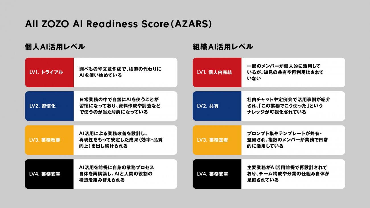 AZARSは「組織AI活用レベル」と「個人AI活用レベル」の2軸で構成されている。各レベルは4段階に定義されており、「組織AI活用レベル」は組織がいかにAIを業務へ組み込めているか、また「個人AI活用レベル」は個人が業務内でAIを活用する力量を評価する指標だ。エンジニアや非開発部門など、職種を問わず共通の評価軸を持つことで、全社的なAI活用度の統一的な可視化・評価が可能となるとした。