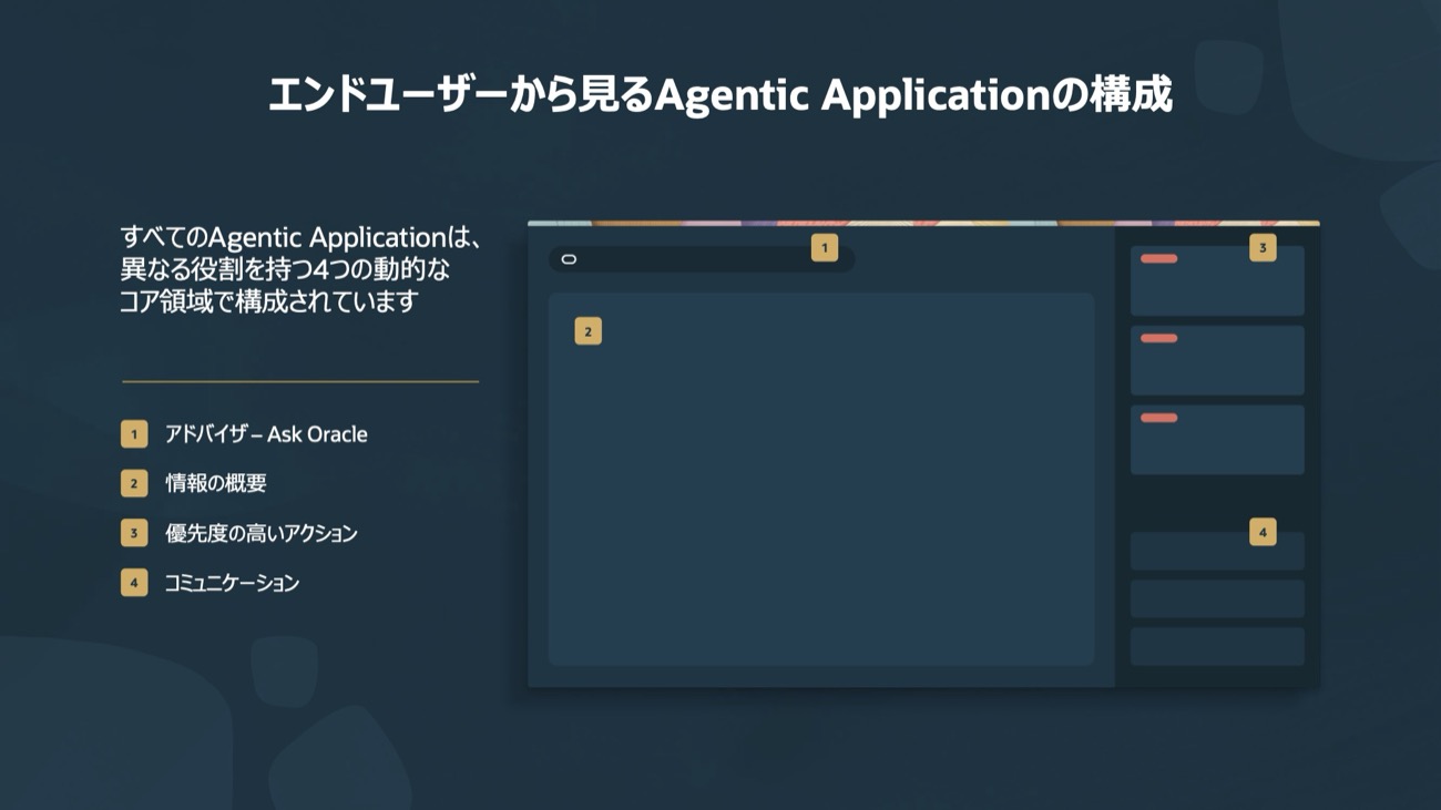 エンドユーザーの操作体験は4つの領域で構成される。チャット形式で質問やタスク実行ができる「アドバイザー(Ask Oracle)」が最上位に位置し、複数エージェントが連携して状況の概要と優先すべきアクション候補を提示する「情報サマリー」、エージェントがアクションを重要度・優先度で自動分類する「プライオリティ・アクション」、そしてメール・PowerPoint・PDFをアプリケーション内から直接生成できる「コミュニケーション」の4層となる。クラパティ氏は「情報収集後にどこか別の場所へ移動する必要はなく、アプリケーション内で完結できる」と述べた。