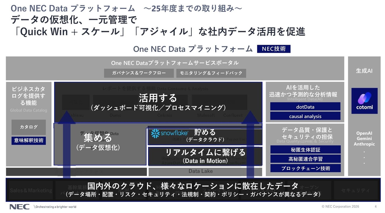 NECは2026年4月14日、データクラウド企業のSnowflakeと共同で記者説明会を開催し、自社の経営意思決定基盤「NEC経営コックピット」にSnowflake Intelligenceを組み合わせた取り組みを公表した。SnowflakeのAIエージェント機能をNEC独自の生成AIサービス基盤「NGS(NEC Generative AI Service)」の技術で強化し、CEOをはじめとする経営層が自らデータに問いかけて即断即決できる環境の実現を目指す。