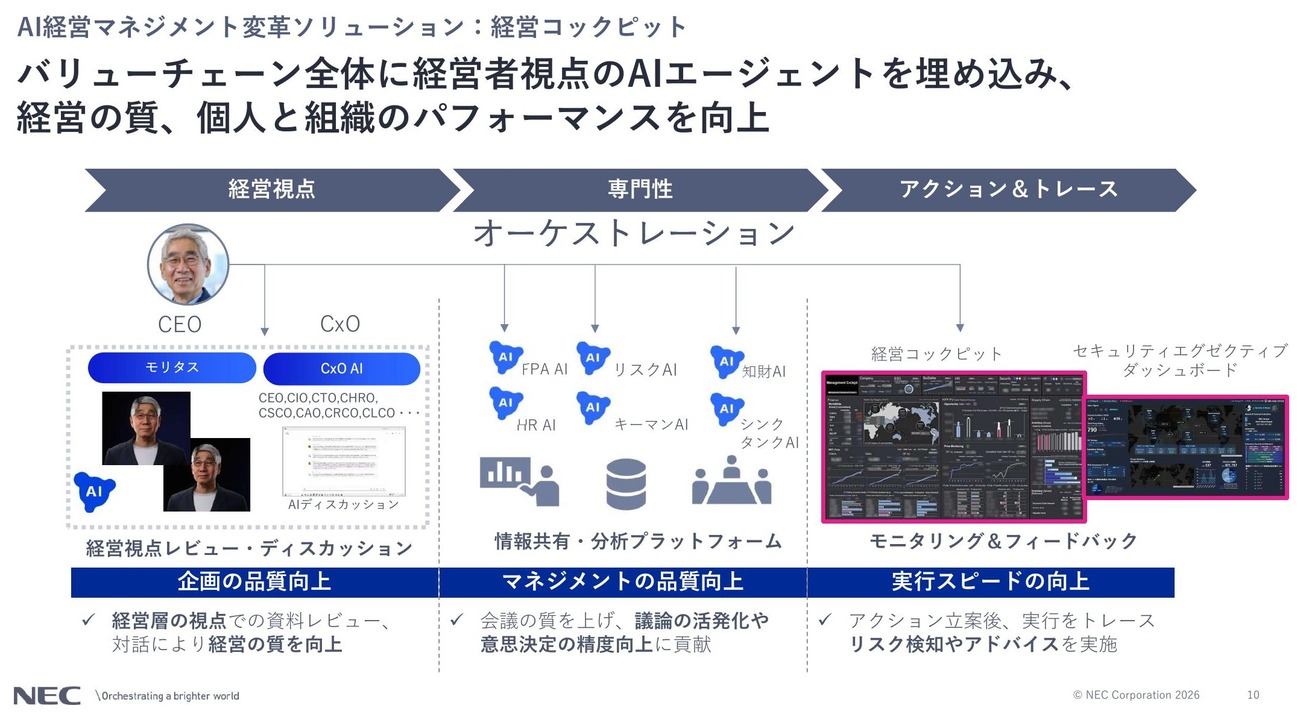 AI経営マネジメント変革のコアソリューションとなる「経営コックピット」では、バリューチェーン全体に経営者視点のAIエージェントを組み込む設計を採用している。「経営視点」「専門性」「アクション&トレース」の3フェーズをオーケストレーション機能が統合する構成で、経営視点フェーズではNECの森田社長をモデルにした「モリタス」と呼ぶCEO AIと、CIO、CTO、CHROなど各CxOに対応したAIが資料レビューや対話を支援する。専門性フェーズではFPA AI(財務計画・分析)、リスクAI、知財AI、HR AIなどが情報共有・分析プラットフォームとして会議の質と意思決定の精度向上に貢献し、アクション&トレースフェーズでは立案後の実行をモニタリングしてリスク検知やアドバイスを行う。