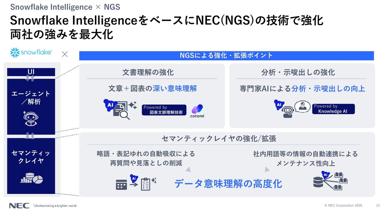 Snowflake IntelligenceとNGSの統合では、文書理解、分析・示唆出し、セマンティックレイヤという3つの観点での強化を図るとした。文書理解ではcotomiの図表文脈理解技術を活用して文章と図表を一体的に解析し、分析・示唆出しではKnowledge AIによる専門家AIが精度を高める。セマンティックレイヤでは略語や表記ゆれの自動吸収によって再質問や見落としを削減し、社内用語の自動連携でメンテナンス性を向上させる。「データの意味理解こそがAI活用の鍵だ」と関氏は述べ、プラットフォームへのセマンティック・オントロジーレイヤ追加が不可欠だとした。