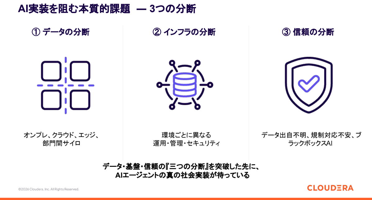 しかし、その実装を阻む本質的な問題として山賀氏が挙げたのが、「データの分断」「インフラの分断」「信頼の分断」という3つの障壁だ。オンプレミスやクラウド、エッジに分散したデータソース、環境ごとに異なる運用管理、そしてデータの出自不明にともなう規制対応への不安などが、企業のAIレディネス(AI Readiness)を阻害しているという。