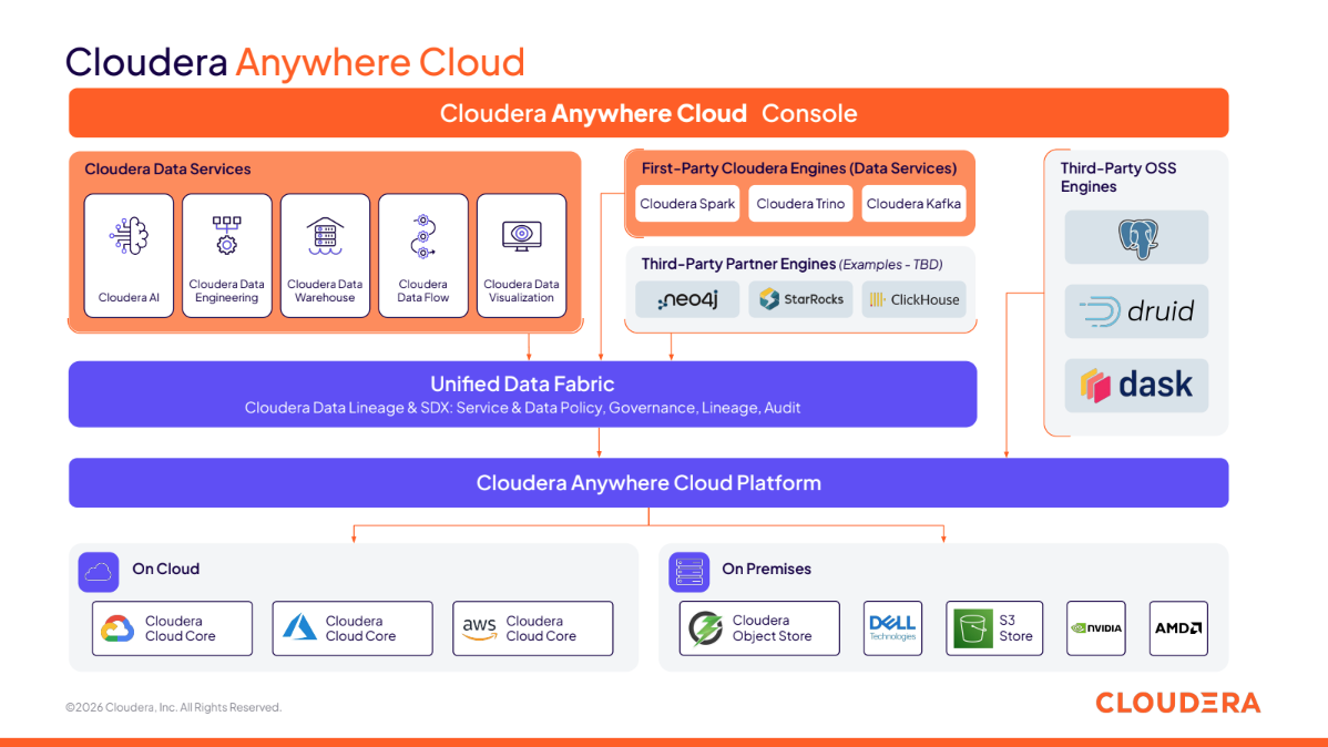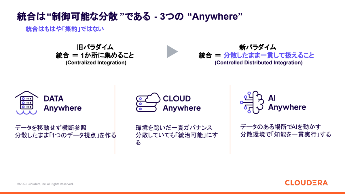 これらの課題に対し、Clouderaが提示する解決策が「DATA Anywhere」「CLOUD Anywhere」「AI Anywhere」という3つの戦略だ。ガゴ氏は、データを物理的に移動させることなく横断参照できる「Unified Data Fabric」の重要性を説きながら、オンプレミスからパブリッククラウドまで、あらゆる環境で共通のガバナンスとセキュリティを適用する「Cloudera Anywhere Cloud」戦略をとると語った。
