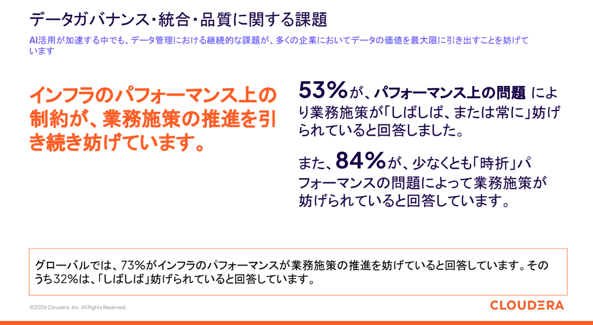 一方で、実態としてのデータ可視性やアクセスには大きな課題が残っている。自社の全データに「形式を問わずいつでもアクセスできている」と回答した日本企業のリーダーは43%、技術者向けに「セルフサービス型のデータアクセスを十分に提供できている」と答えたのは37%にとどまった。また、「ITインフラのパフォーマンス不足が時折業務施策を妨げている」と回答した割合は84%に達しており、基盤の脆弱性がAI活用の足かせとなっている現状が浮き彫りになった。