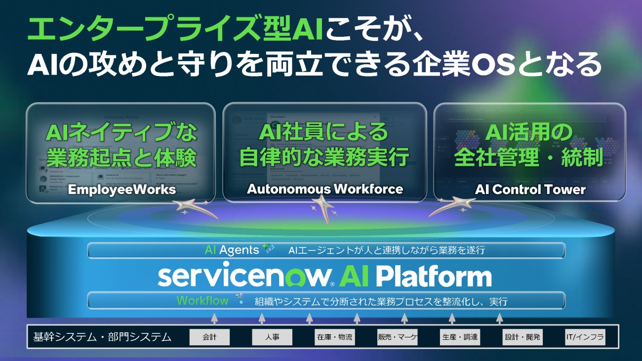 さらに、具体策として3つの主要ソリューションを提示。従業員の窓口となる「EmployeeWorks」、自律的にロールを担う「Autonomous Workforce」、そしてガバナンスの管制塔となる「AI Control Tower」だ。特にセキュリティ面では、4月20日(米国時間)付けで買収完了を発表したArmisに触れ、「OTやフィジカルAIも含めた広範な資産をエージェントレスで保護し、AIが安心して働ける環境を整える」と語った。