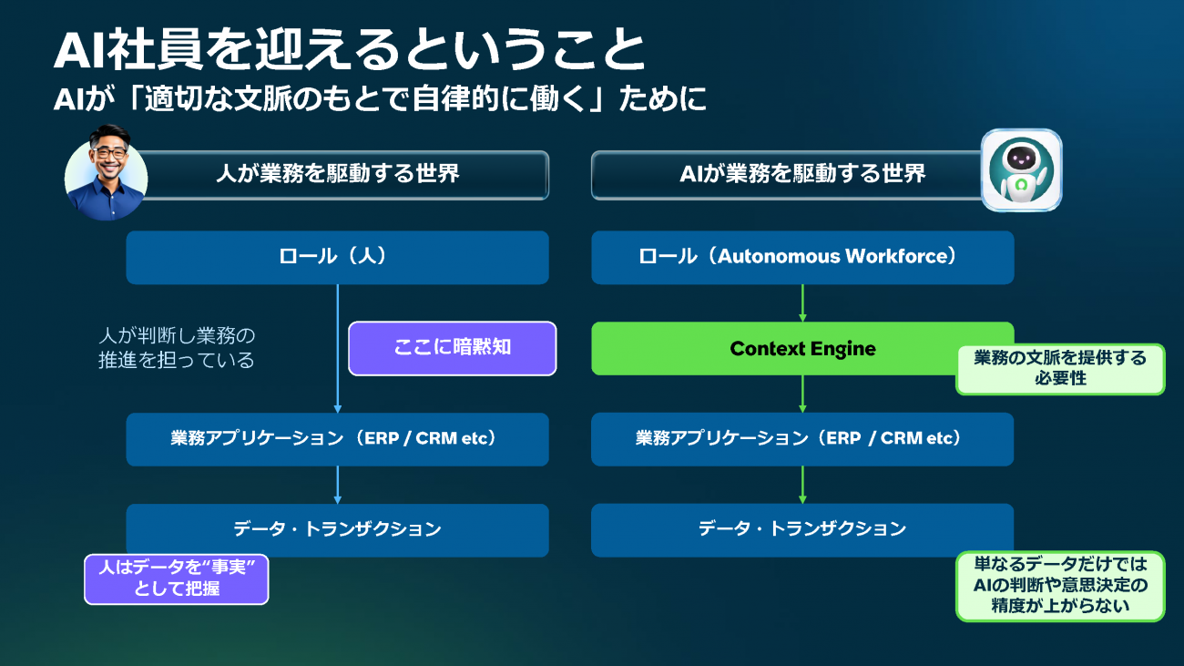 また、AIがより高度な判断を行うための新機能「Context Engine」についても言及。「AIを社員として迎え入れるには、単なるデータだけでなく、業務の文脈(コンテキスト)を理解させることが重要だ。これにより、AIが人と同等、あるいはそれ以上の精度で業務を完結できるようになる」と、その重要性を説いた。