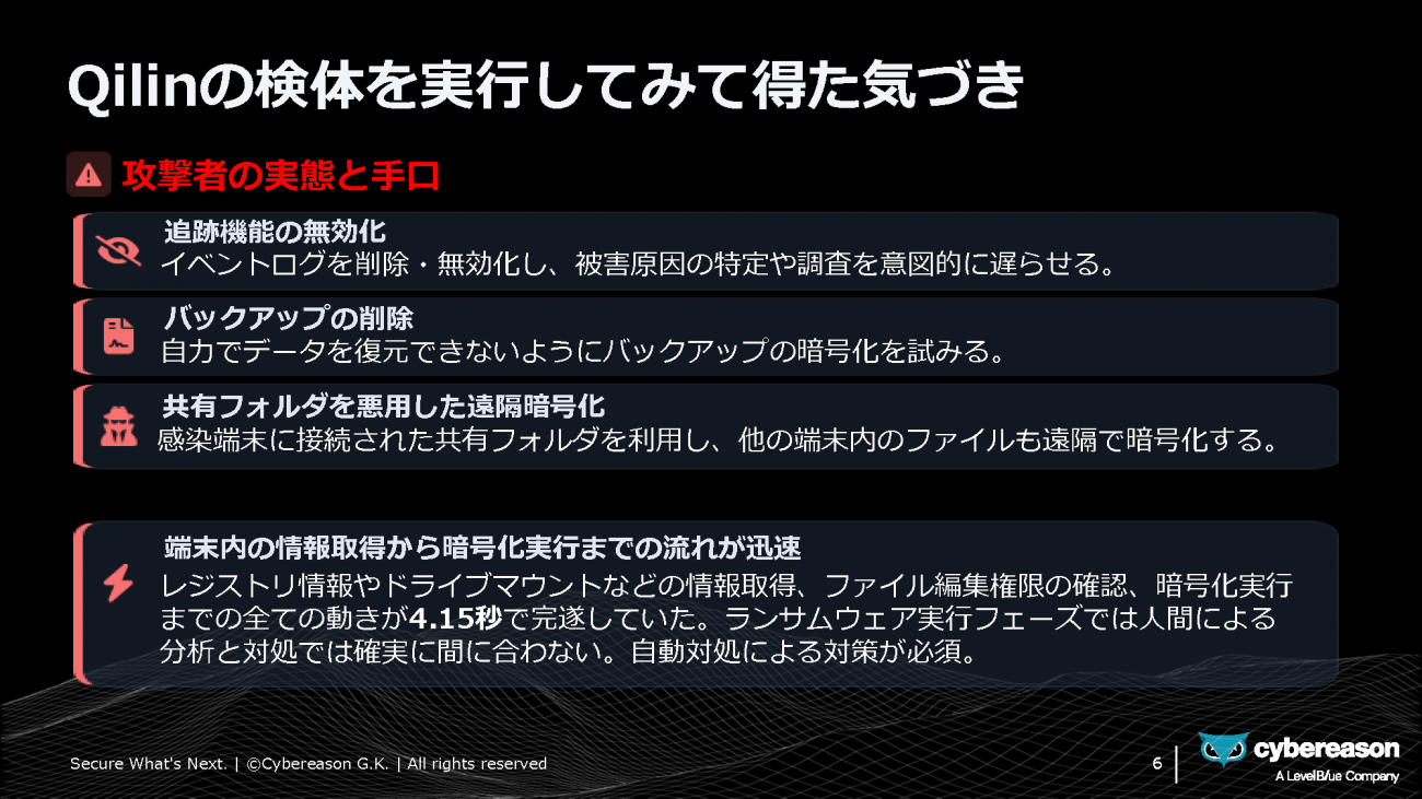 検証の結果、Qilinは侵入後にイベントログの削除やバックアップの無効化を組織的に行うことが判明したという。驚くべきはその実行速度である。情報の取得から暗号化完了まで、わずか「4.15秒」で完遂されたという。松原氏は「このスピードでは人間の目による対応は不可能であり、自動対処が必須となる」と断言する。