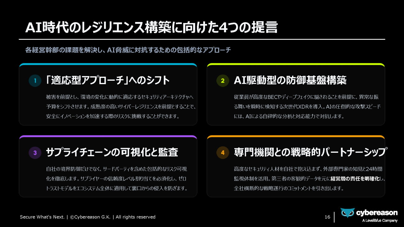 また、CIOの62%が「予防よりも事後対応にコストを費やしている」と回答しており、サプライチェーン攻撃への可視性不足や、戦略のサイロ化が組織的な課題であると指摘。遠藤氏は「被害を前提とし、環境に動的に適応する『適応型アプローチ』へのシフトが必要だ」と訴えた。