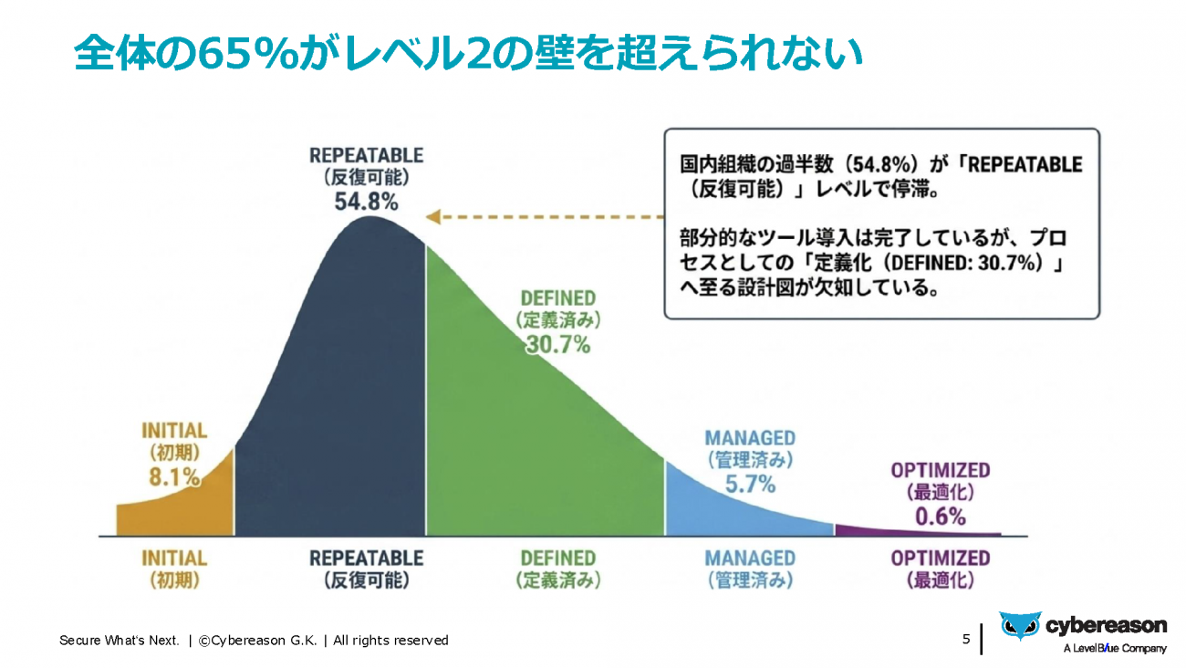 調査によると、日本企業の成熟度平均スコアは5段階中「2.26」であり、過半数が「REPEATABLE」レベルで停滞しているという。有賀氏は「ガバナンスは形式上整備されたものがあるようだが、機能しているかは別」と強調した。特に経営層は「ツールを入れたから安心」と高評価を付けがちなのに対し、現場の情報システム部門はアラートへの対処フローが未整備であることに恐怖を抱いているという認識の乖離を指摘する。
