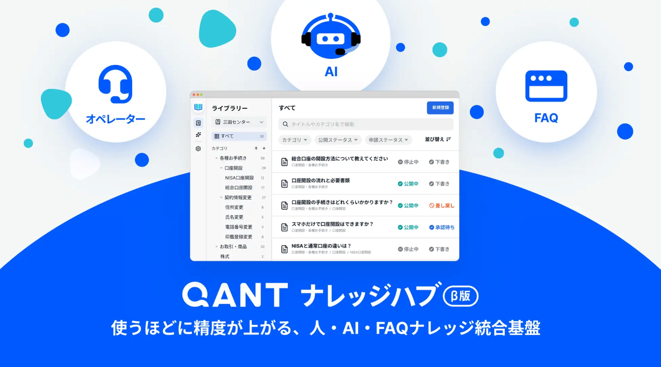 RightTouchは4月28日、AIコンタクトセンターの実現に向けてナレッジ統合基盤「QANT ナレッジハブ(β)」の提供を開始した。同基盤は、FAQやマニュアル、応答スクリプトなど従来バラバラに管理されていたナレッジを一元管理し、AIと人が同じ情報を参照しながら応対できる環境を提供する。